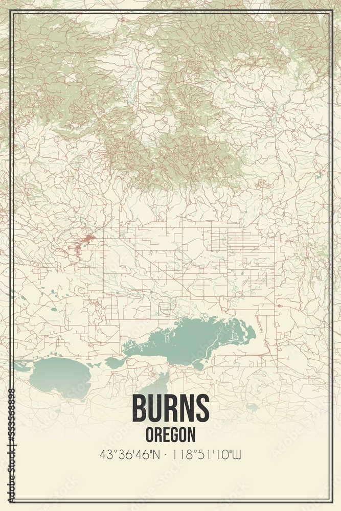 Retro US city map of Burns, Oregon. Vintage street map. Stock